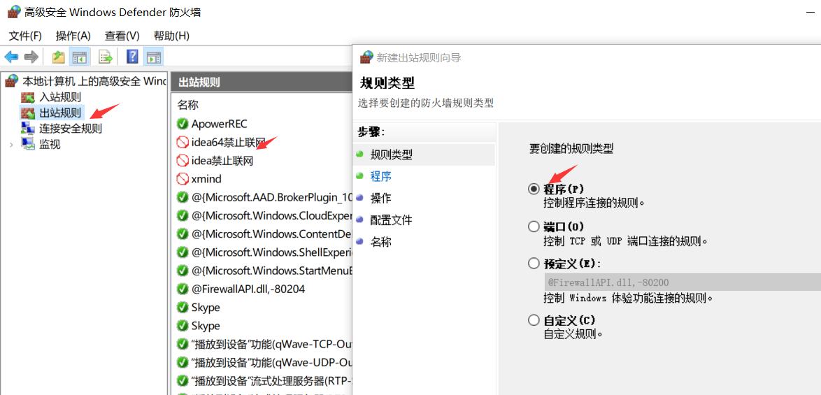 win+r -> wf.msc -> 出站规则 -> 右键新建